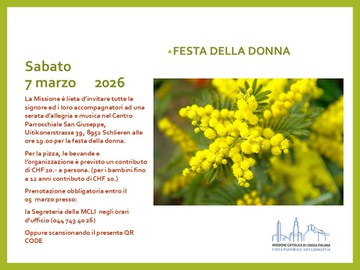 La Missione è lieta d’invitare tutte le signore ed i loro accompagnatori ad una serata d’allegria e musica nel Centro Parrocchiale San Giuseppe, Uitikonerstrasse 39, 8952 Schlieren alle ore 19.00 per la festa della donna.