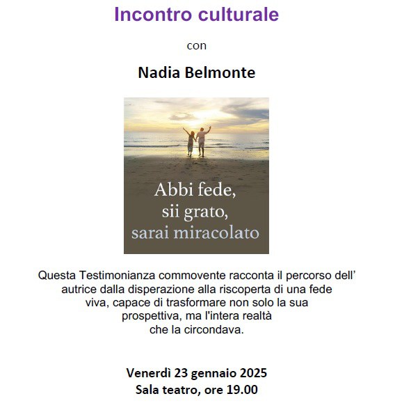 Venerdi' 23 Gennaio 2025 Sala Teatro ore 19:00 Incontro culturale con Nadia Belmonte